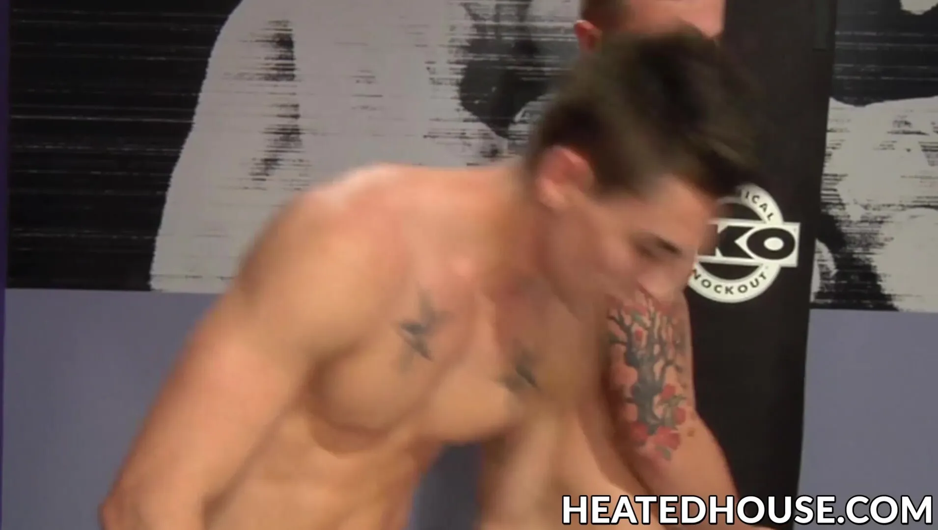Johnny spars with James then drops to suck him dry. James bends over the bag, and Johnny fucks his tight ass. James rides until they finish with loud grunts.