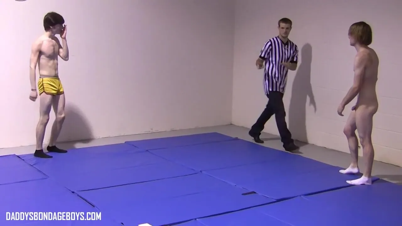 Adam and Lester circle on the mat under Tyes sharp gaze, lean bodies tense, eyes locked as they lock up, muscles flexing with every takedown attempt.